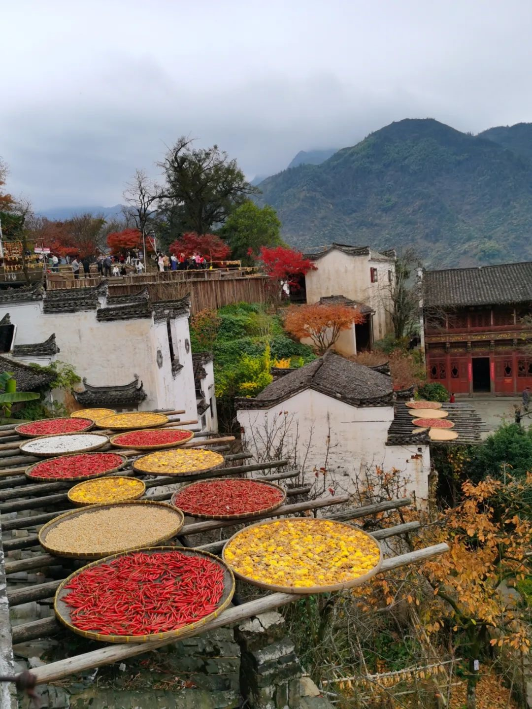 篁嶺因"曬秋"聞名遐邇, 在這里,家家戶戶都曬著辣椒、玉米、南瓜等農(nóng)作物,高高的樹枝上掛滿了柿子,紅黃相間。